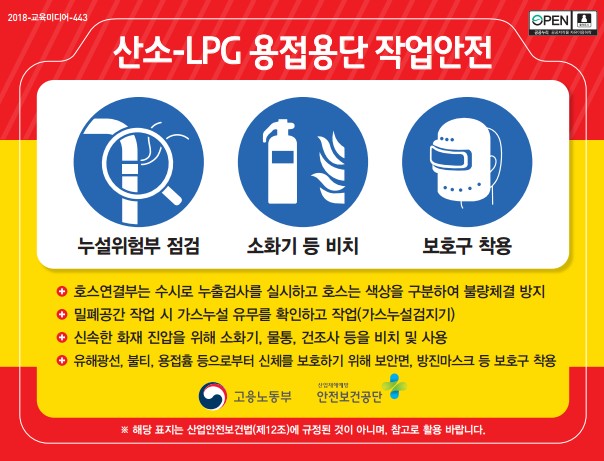 ![]() “(안전보건스티커) 산소-LPG 용접용단 작업안전” 저작물은 “공공누리 4유형(출처표시, 상업용금지, 변경금지)” 조건에 따라 이용할 있습니다. |